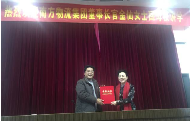 官金仙董事长还通过多媒体向师生介绍她现在的物流企业。她二十几年如一日,将一个小小的货运部发展成为现在拥有十二大物流基地、业务网点遍及全国170多个大中城市的综合型现代化物流企业——“广东亚新平台-亚新(中国)一站式服务平台有限公司”。官金仙董事长领导的亚新平台-亚新(中国)一站式服务平台在推动和引领中国民营物流企业由传统经营模式向现代经营模式转变和改革的过程中做出了积极的贡献,从担当起“振兴家族”意识——“企业家责任”意识,实现了人生道路上的重大飞跃,讲到这里,全场爆发了热烈的掌声。